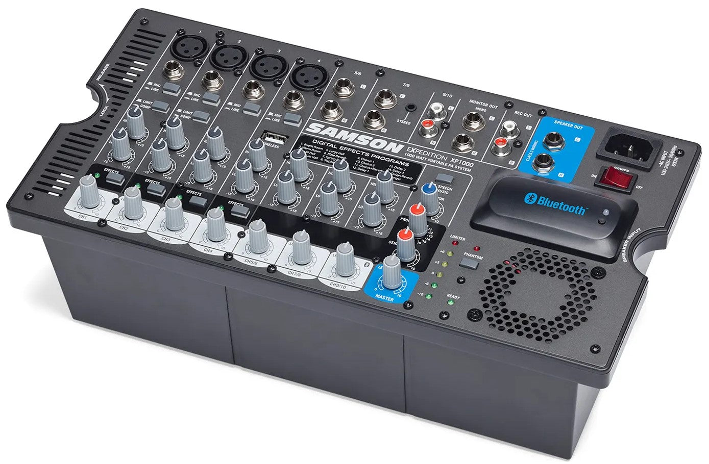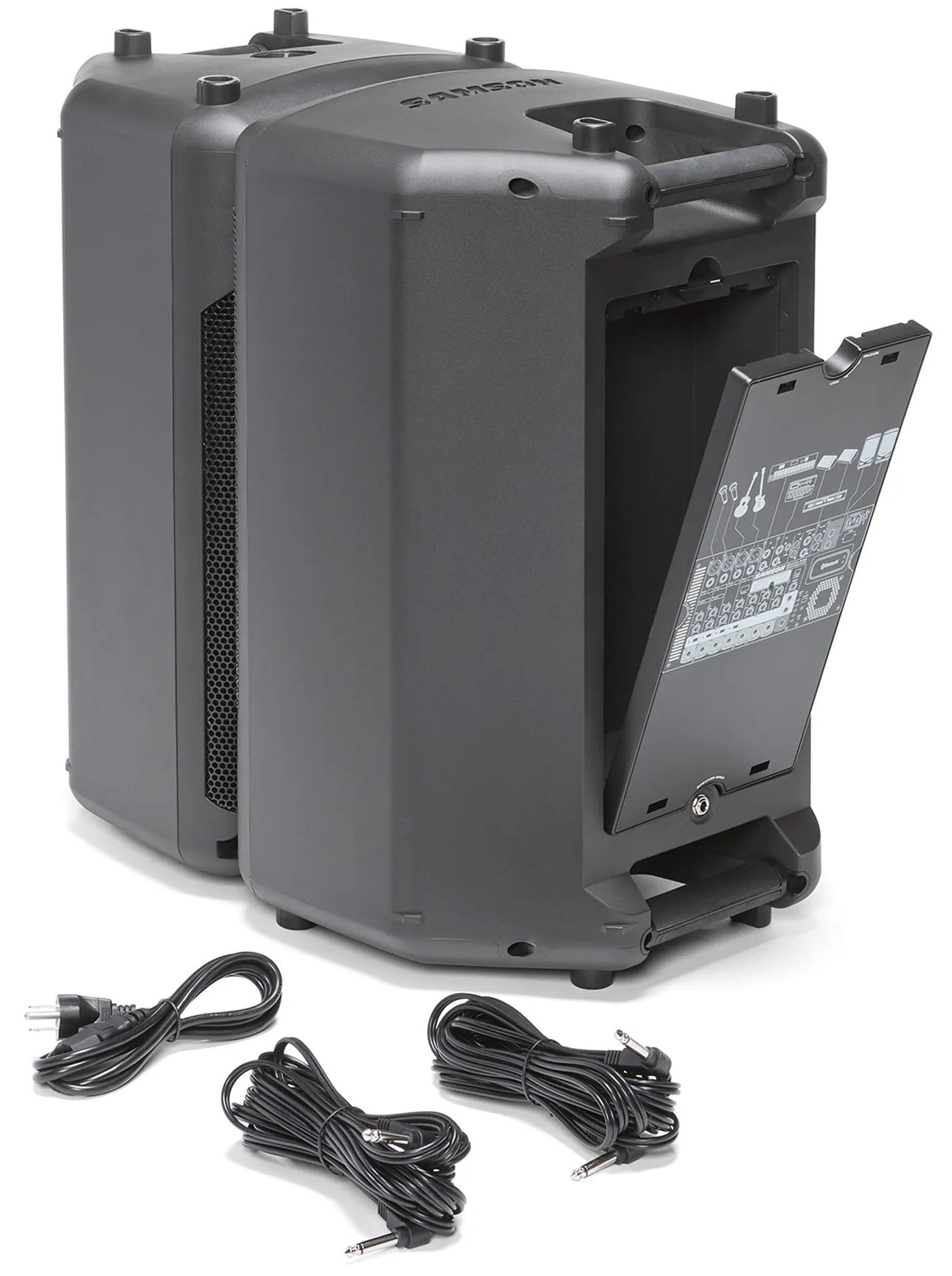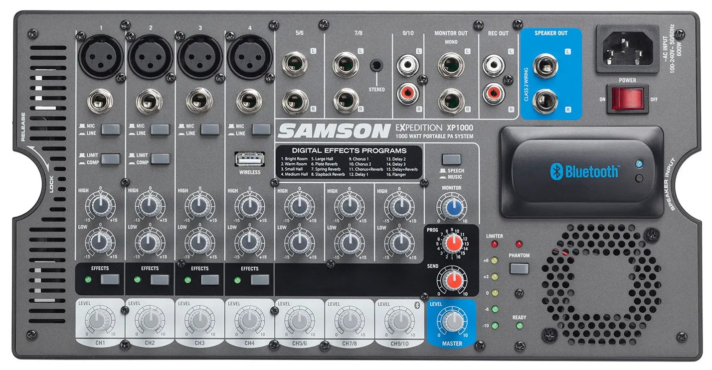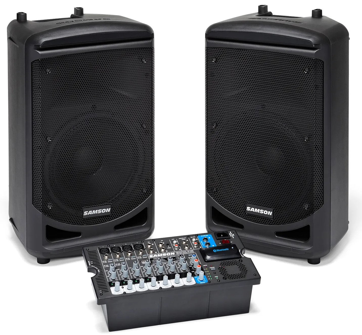 The mixer features built-in 24-bit effects with 16 presets to select from. Each channel has an independent bass and treble control for tone shaping. The dual speakers each sport a 10" woofer and a 1" high frequency driver with a 60° by 90° dispersion. Their ABS enclosures have an integrated 1 3/8" speaker stand mount and a 30° kickback design to allow for versatility in mounting or floor placement options. A set of speaker cables are included.