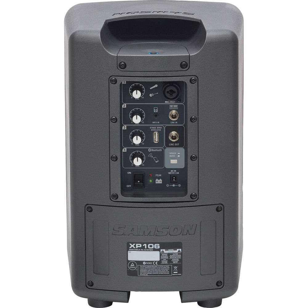 The XP106's 4-channel mixer offers multiple input options with separate level controls, including an XLR-1/4" combo channel (can be used with the included dynamic handheld microphone and other mic/line level devices), a 1/4" channel (guitars and other line level devices), a 1/8" channel (MP3 players, keyboards, etc.), and a Bluetooth channel for wirelessly streaming music from your smartphone, tablet, or laptop. The XP106 also features a line out to cascade multiple systems and expand your sound, as well as a music/voice switch to optimize the output EQ for voice or music playback. The system even has a USB Wireless port to integrate a Samson XPD USB Digital Wireless System (not included) for a completely wireless audio solution.