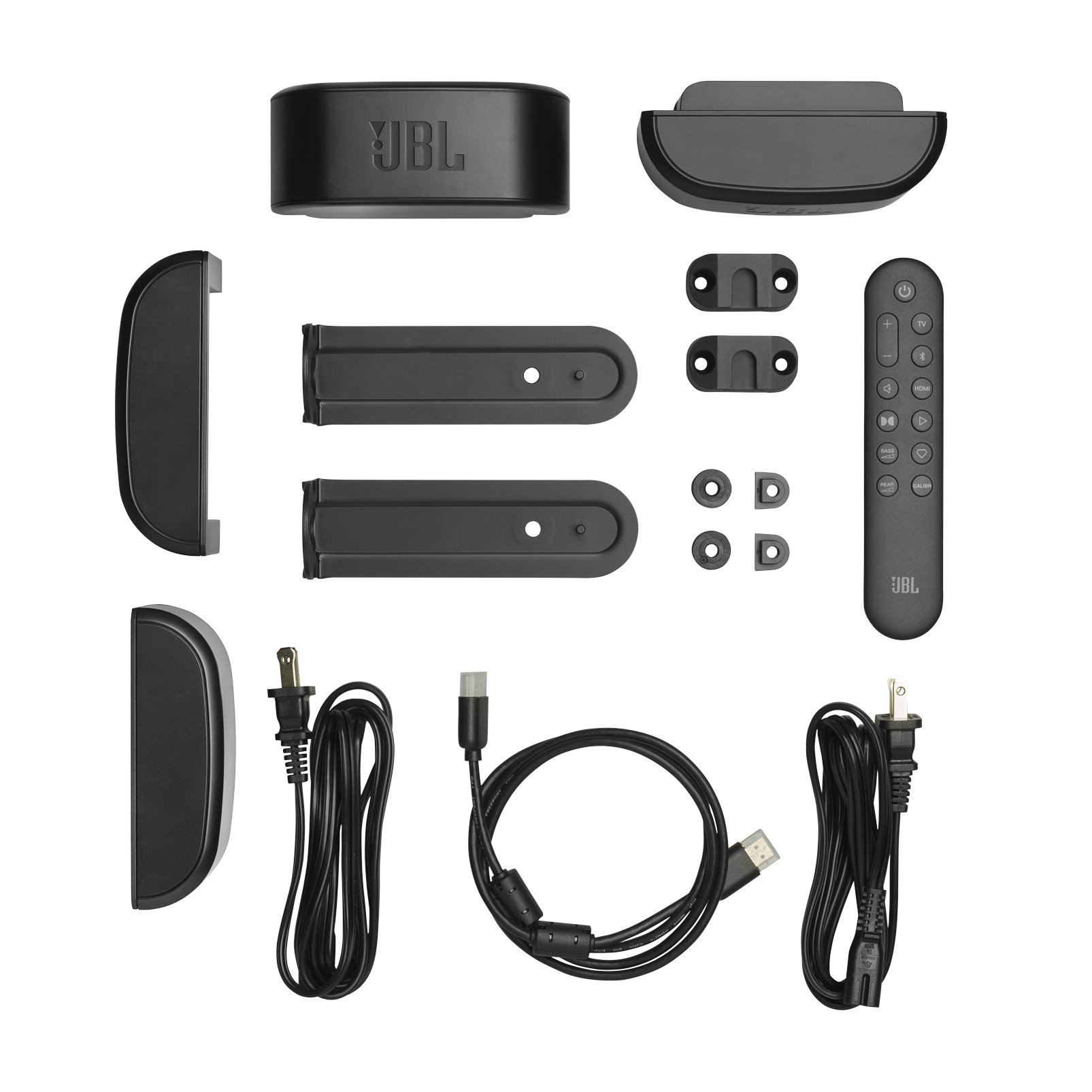 - Wall-mount brackets: two L-shape for main bar + two U-shape for surround speakers