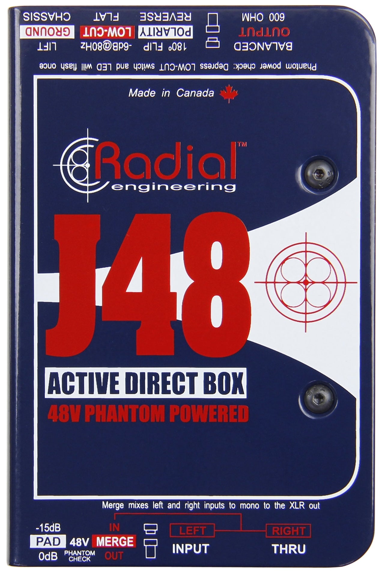 The unit retains the natural sound of the instrument by using 48V phantom power to produce a higher internal rail voltage, which allows the J48 to handle transients of up to 9V without chocking. The result is more dynamic headroom and less square wave distortion. It features a merge switch that sums stereo instruments to mono as well as ground lift, -15 dB pad, and 180° phase reverse switches. It's constructed from a rugged 14-gauge steel and comes with a 3-year transferable warranty.