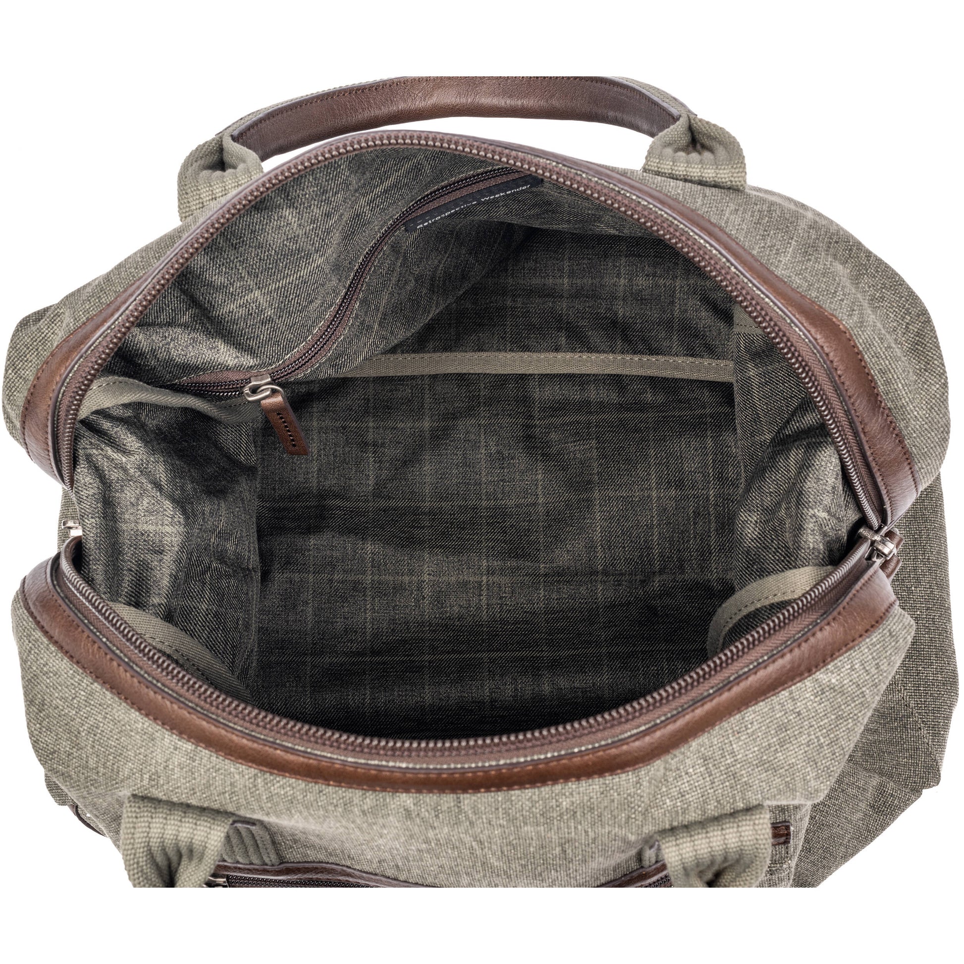 - Main compartment: Wide clamshell opening with soft twill lining