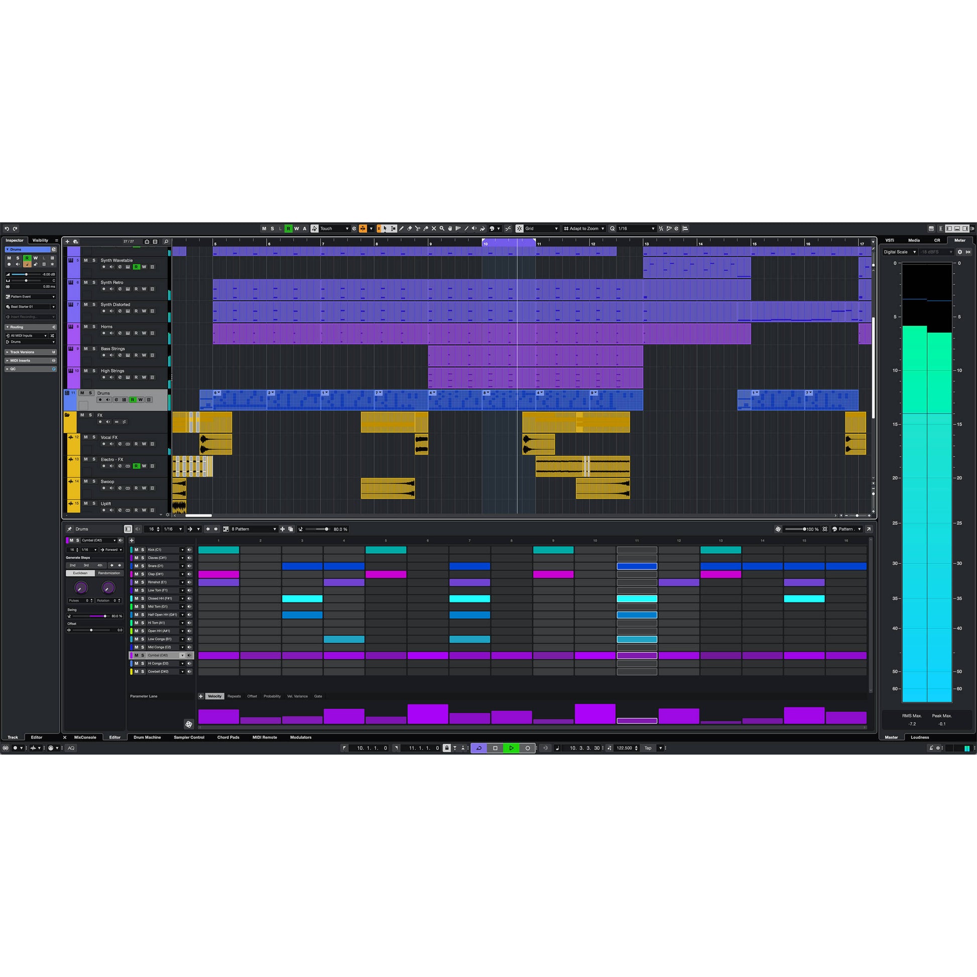 Cubase Artist introduces powerful new tools for beat-making, including the Drum Track and Pattern Sequencer, allowing artists to create intricate rhythms and patterns with ease. Import samples, program beats, and explore groove options for total rhythmic control.